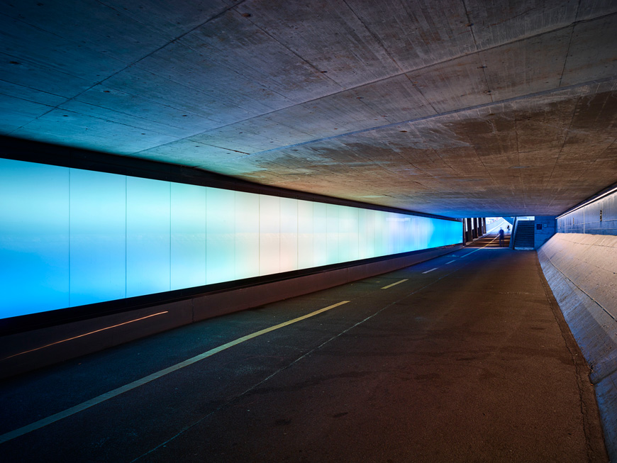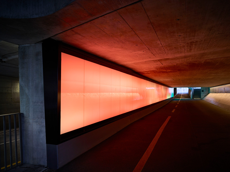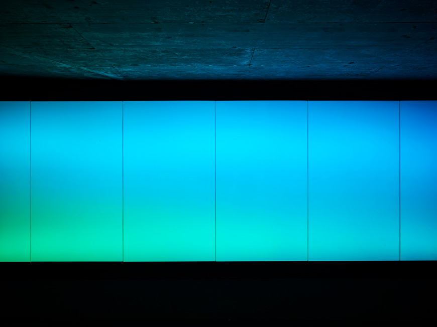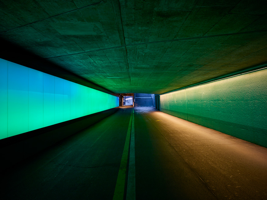Die Hotelbar in der Eingangshalle wurde mit flachen RGB-Leuchten optisch aufgewertet und die Arbeitsfläche für das Bar-Personal wird mit weissem LED-Licht beleuchtet. Die gleichen Leuchtentypen werden auch im Zeitschriftenständer sowie im Souvenirshop eingesetzt um das Ausstellungsgut hervorzuheben. Da alle Leuchten direkt im Möbel verbaut sind, treten sie nicht als störendes Element hervor. Im Flugi-Salon, dem Bankettraum des Hotels, werden die runden Fensterbögen dezent und blendfrei von unten her angestrahlt.